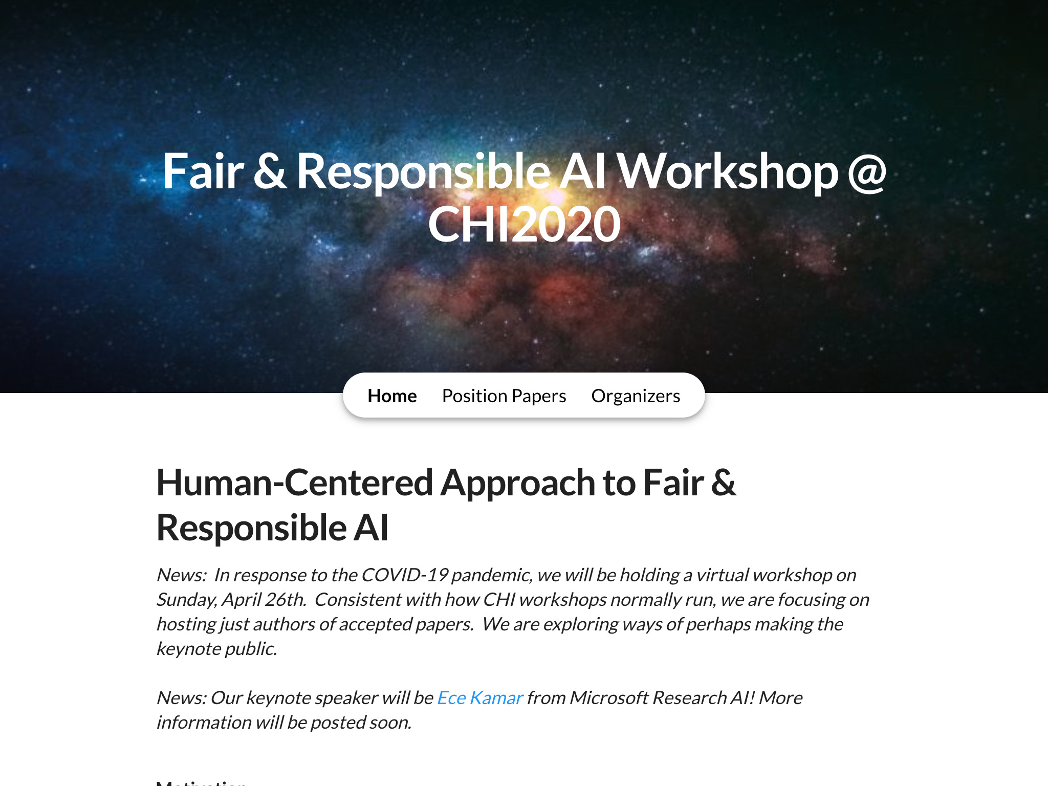 Last week, the CHI 2020 conference would have been held in Hawaii. Alas, we’re in the midst of a global pandemic, so people had to go virtual. One of the workshops in the conference that held a virtual workshop was Fair & Responsible AI Workshop, organized by Min Kyung Lee et al. The workshop brought together researchers and practitioners to develop a cross-disciplinary agenda for creating fair and responsible AI systems. You can check out the workshop website and position papers at http://fair-ai.owlstown.com/.