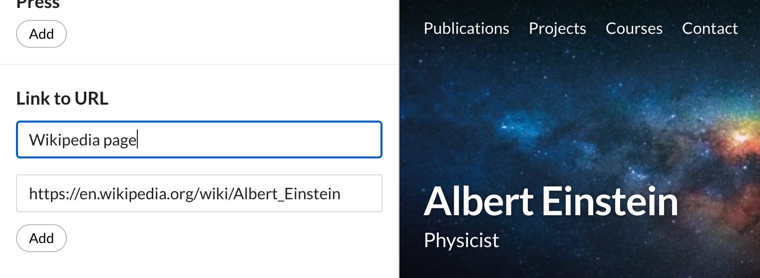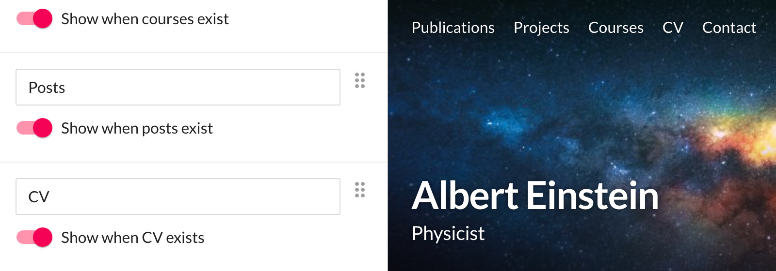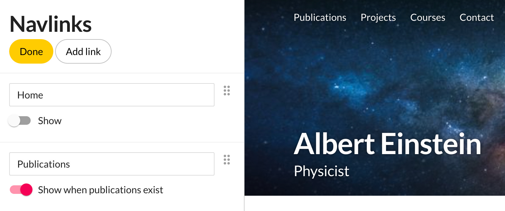 The navigation bar automatically shows default links, such as Home, Publications, Projects, Courses, and Posts. Now, you can hide specific links. For example, hide the “Home” link.